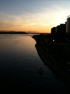 Race Day began at 7am with the 2.4 mile swim in Tempe Town Lake. There they are below in the distance, all 2.880 of ’em. Get ‘er done y’all, get ‘er done.