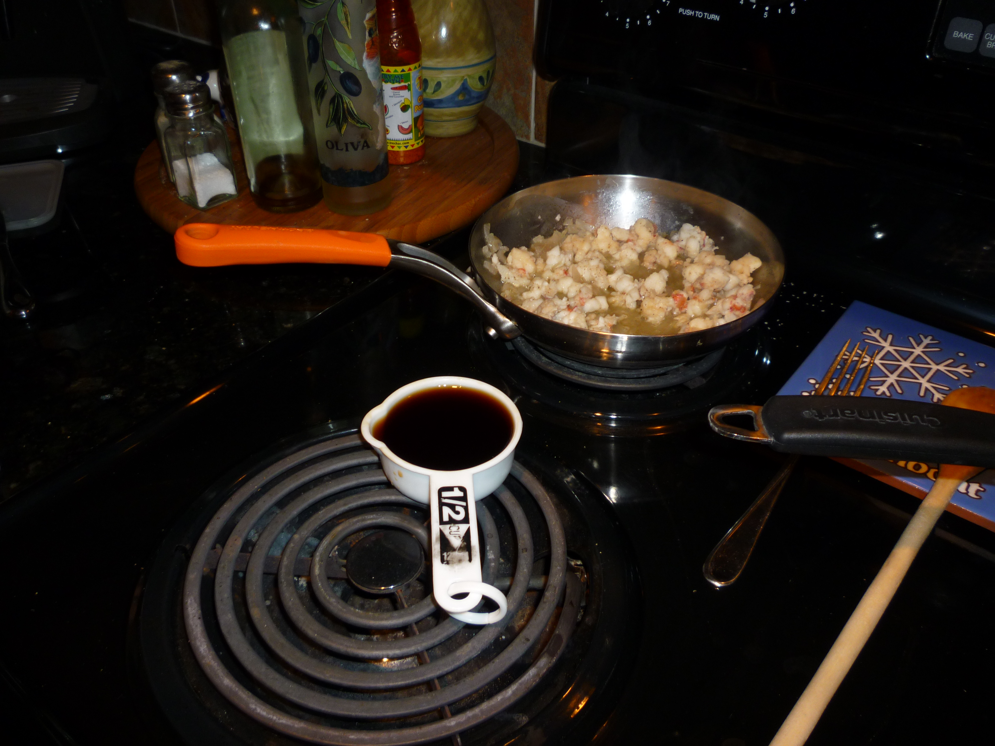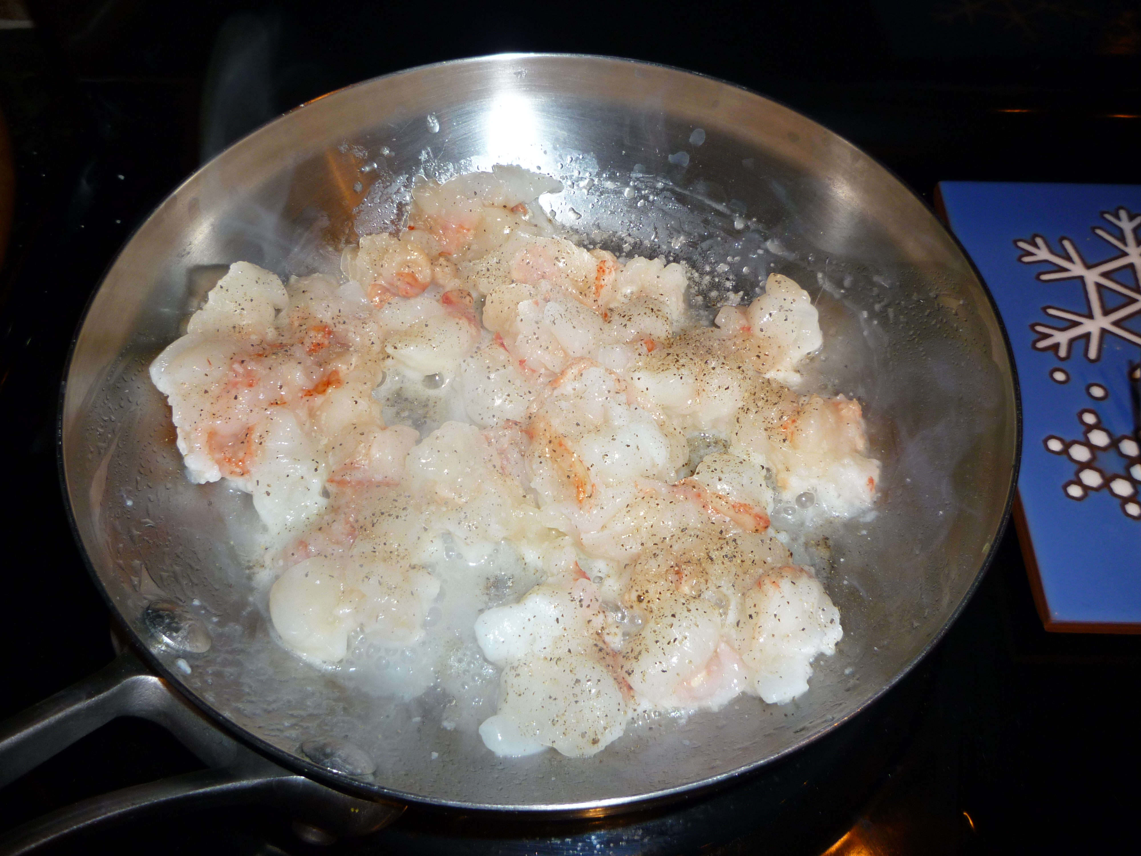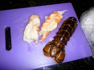 Chop up 12 oz lobster tail (organic from Central Market of course), then saute in butter with salt and pepper