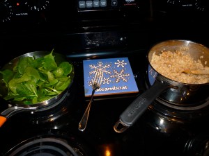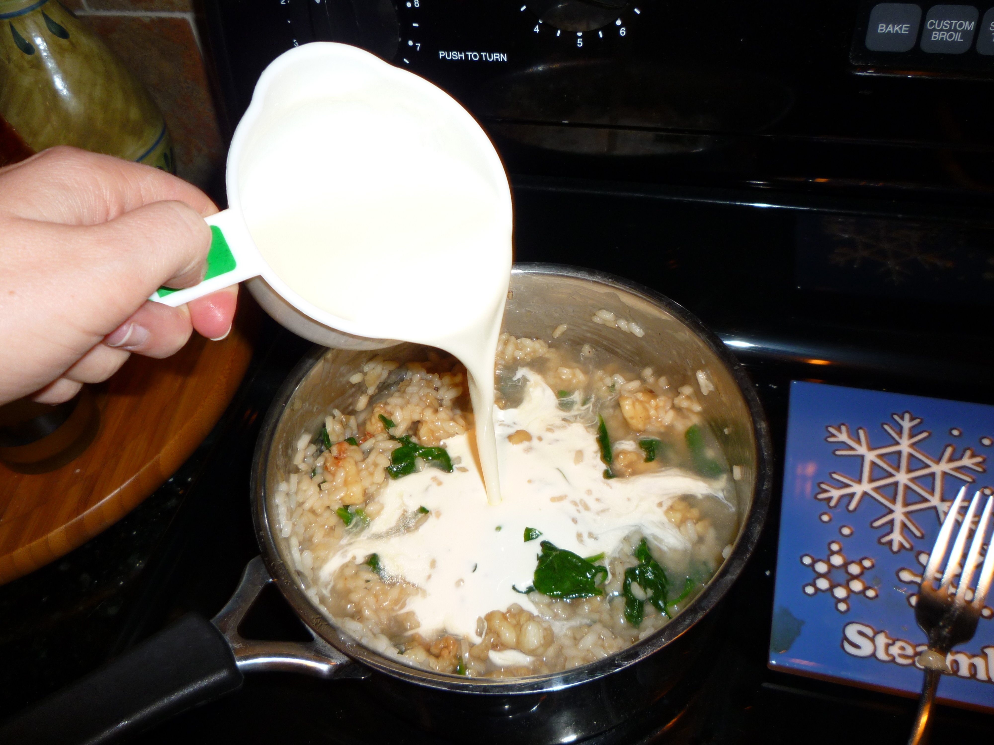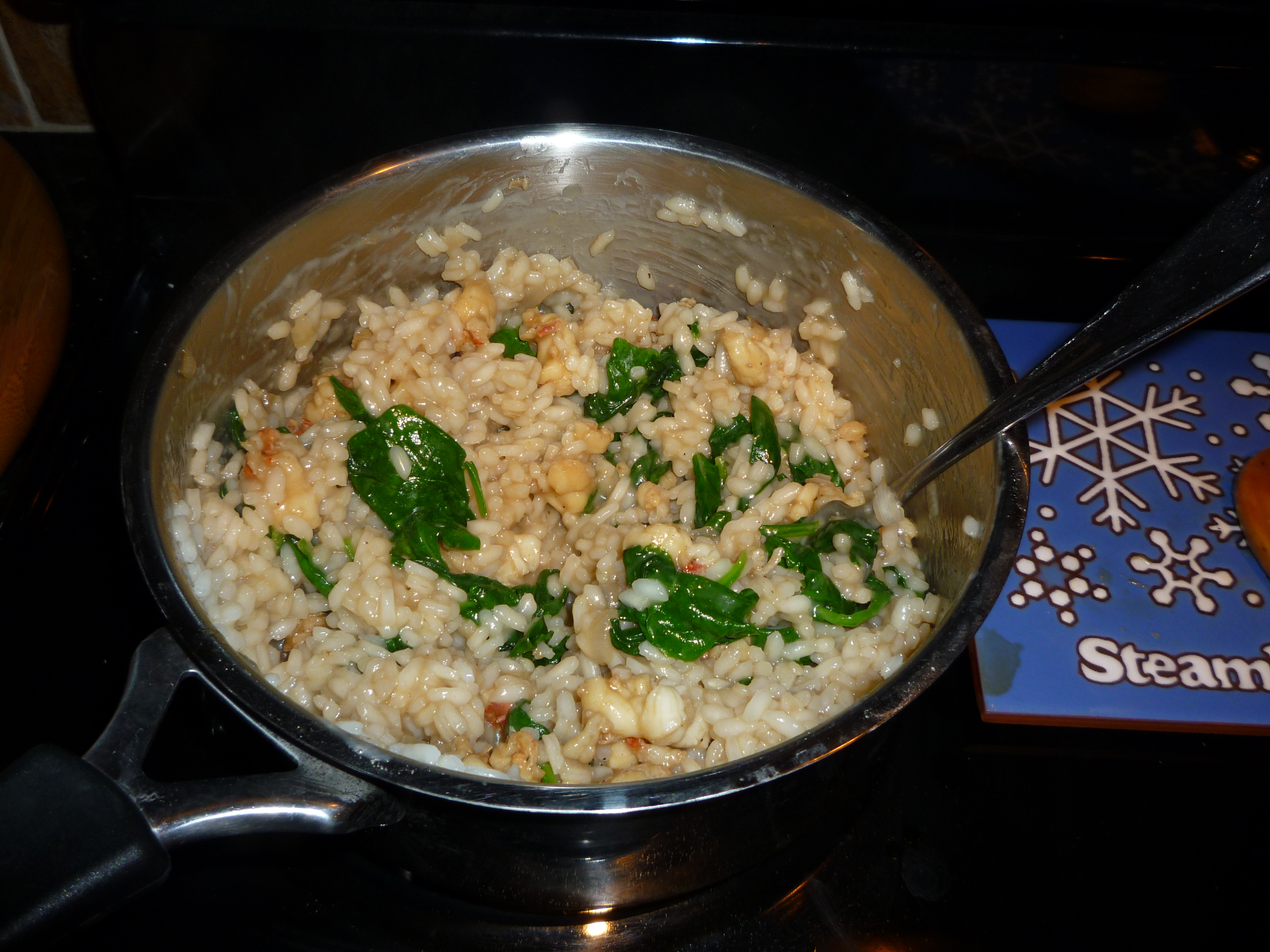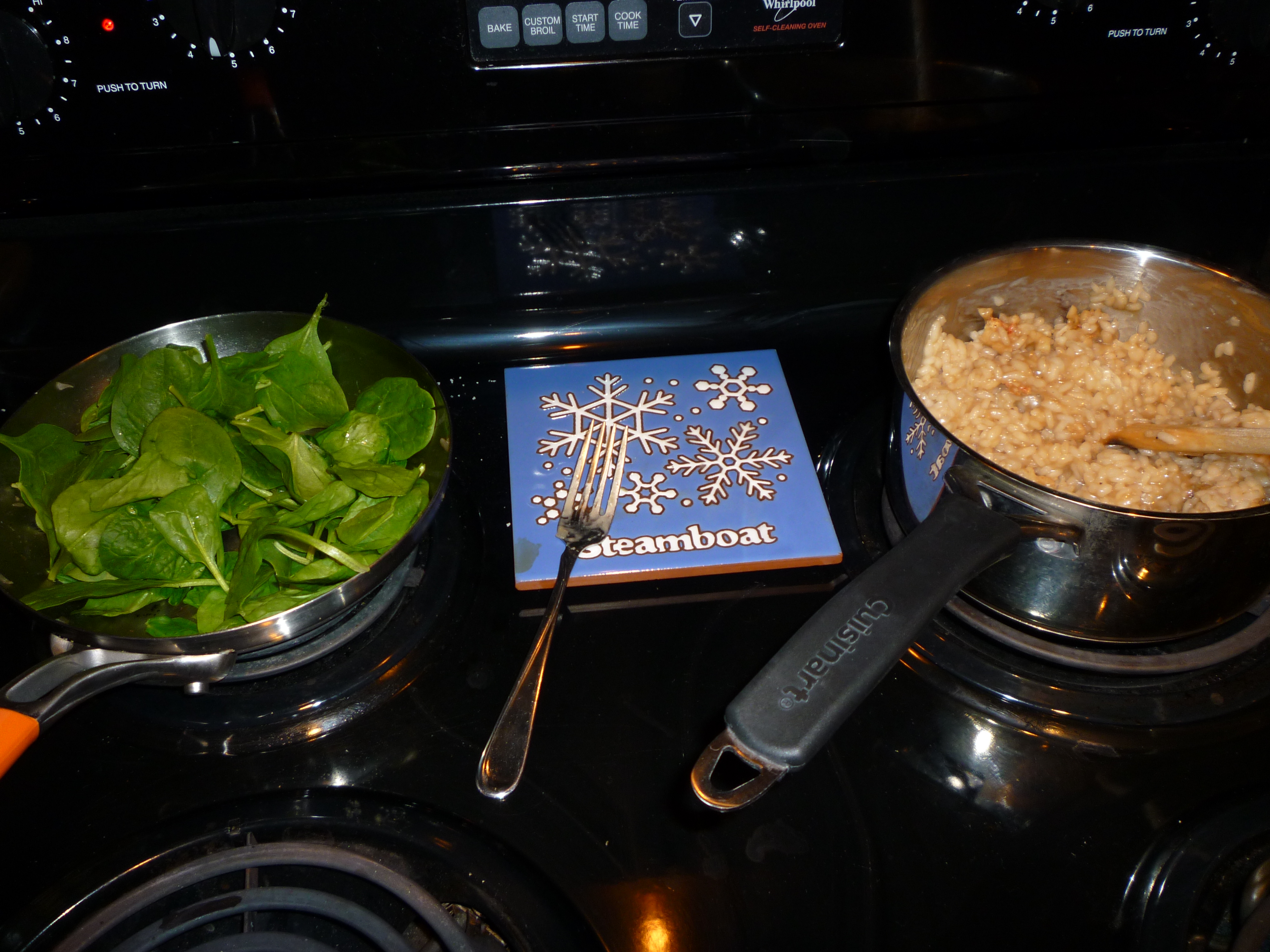 Add the lobster mixture to the cooked risotto and then toss some Spinach into the old lobster pan and saute