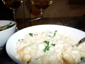 Cook 1 cup risotto according to label, but use 1 cup white wine, 1 cup water, and 1 cup fish stock, instead of all water