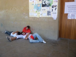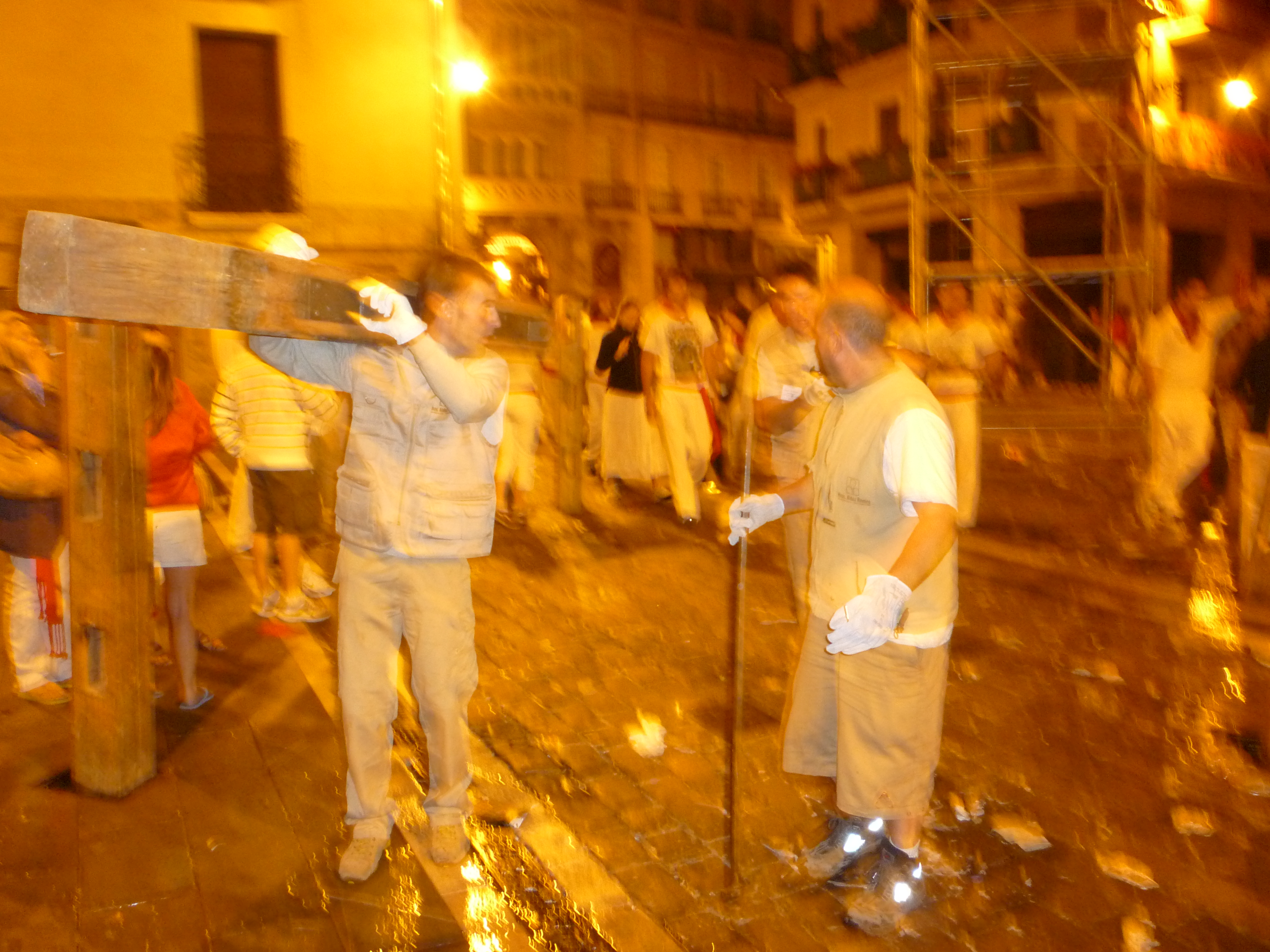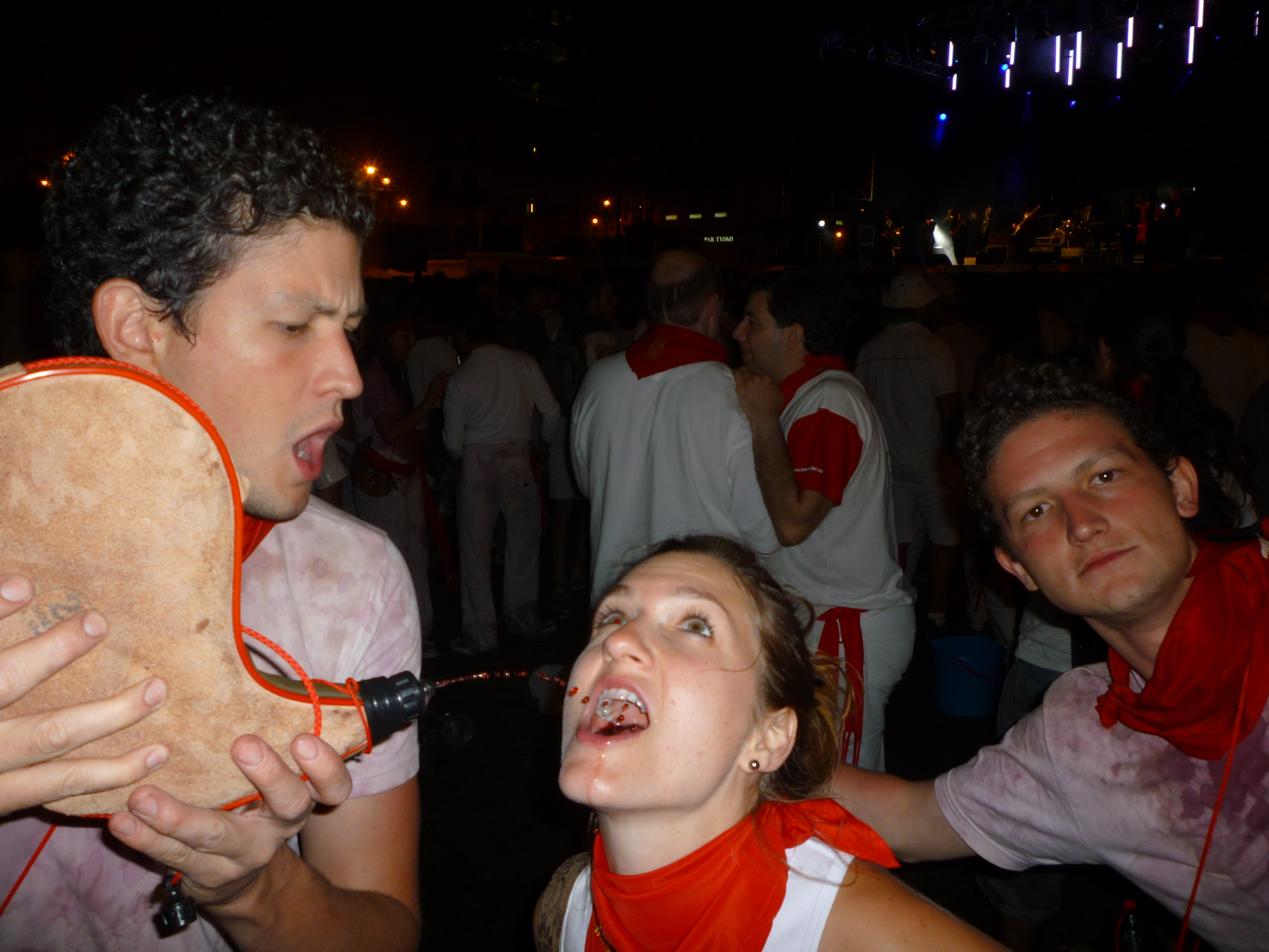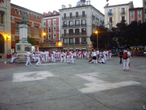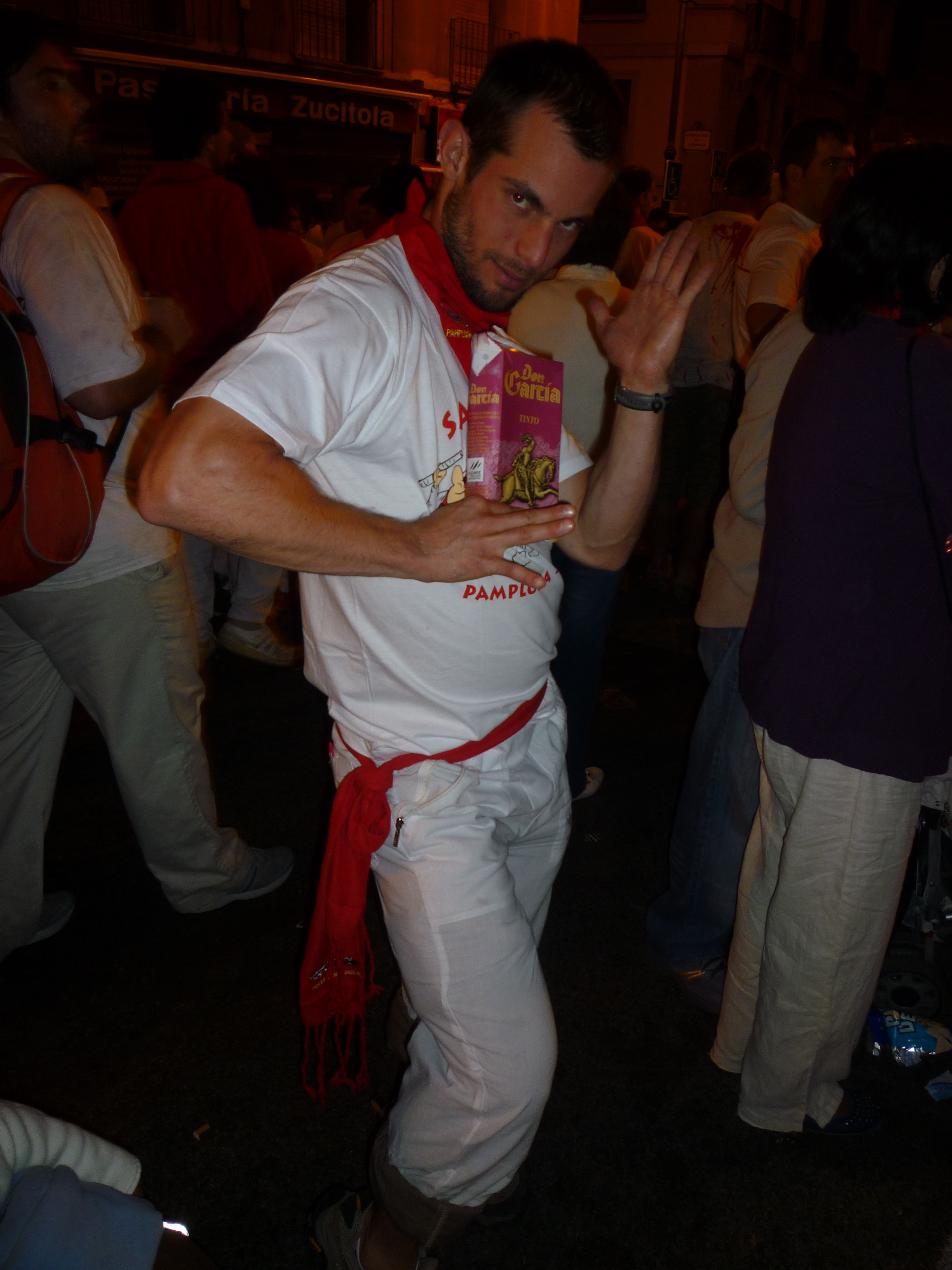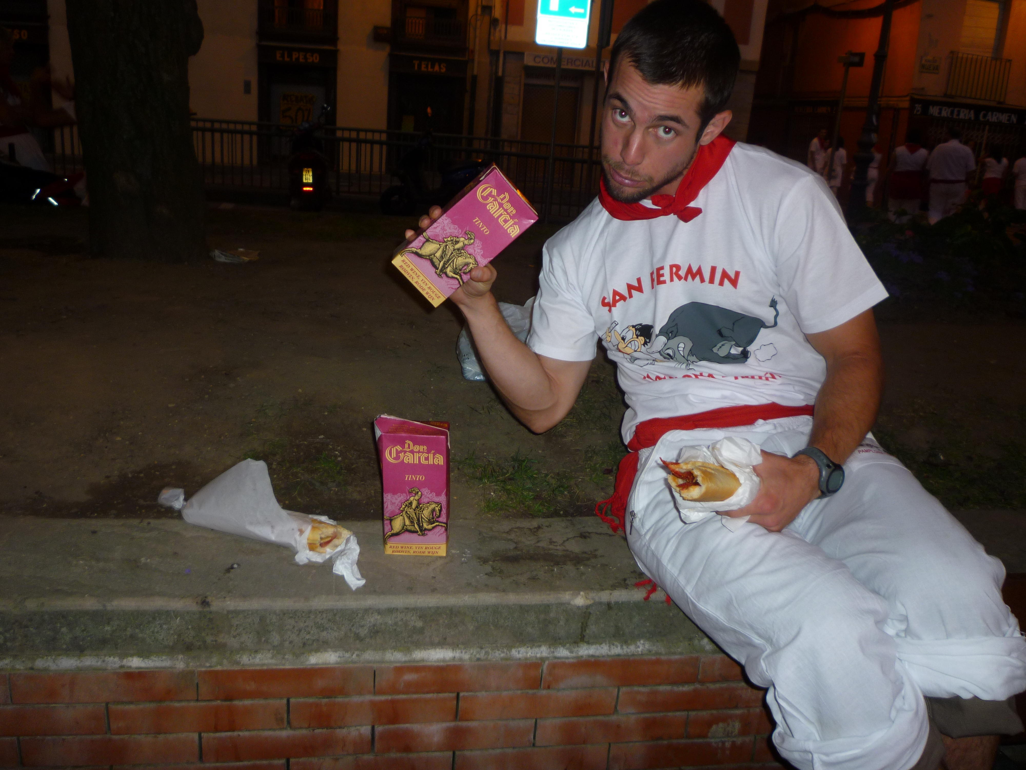 Getting to said plaza (above) was a bit of a journey as we schlepped our 20 kilo bags through narrow and crowded streets, knocking aside reveler after drunken reveler with our loot. People in Europe lack in innate spacial understanding of objects, and therefore I always felt I had to plow through people when the requisite “perdona” didn’t seem to accomplish what I was envisioning/had been brought up to understand. Whatevs. Maybe I was just jealous that I had to carry a stupid bag instead of dancing around in a wine waterfall. It’s hard to tell. We proceed to drop off our bags (no place to sleep for the night, but at least our bags are safe) and grab dinner: bocadillos and a box of red wine.