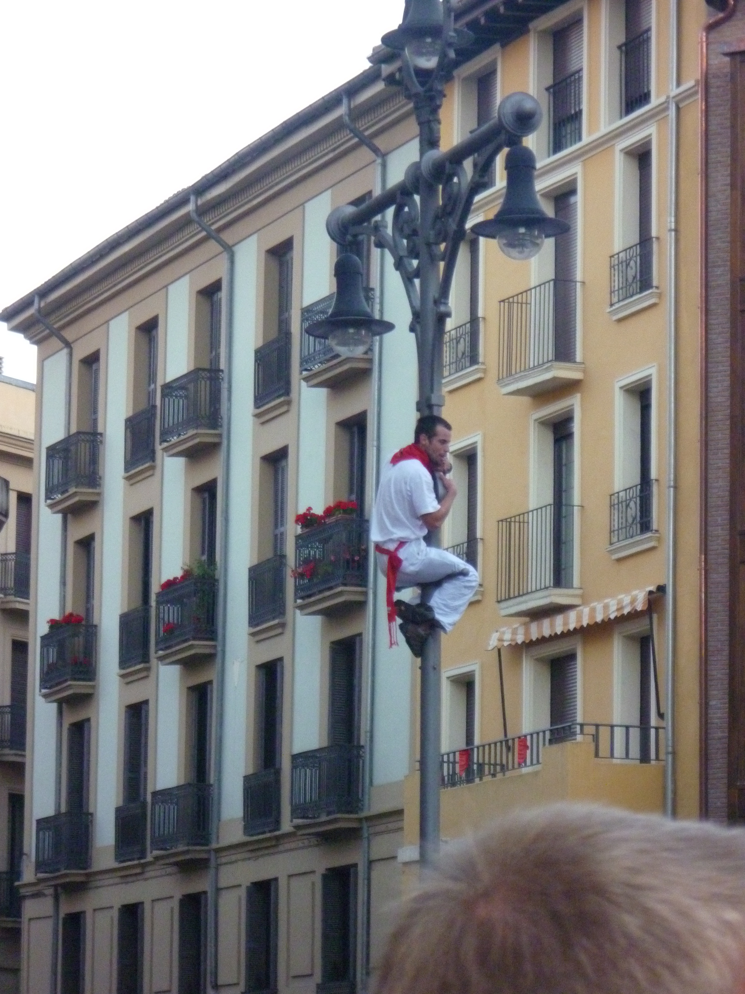 Since we were too late for a place up on the fence, I find a spot on the ground and crouch between legs to catch a glimpse of the track. Lonster, not satisfied with my choice, takes off. I spot him later scaling a lamp post for the best vantage point in the vicinity. You little monkey you. He is soon told to get down by the beret toting Basque policemen. Shame.