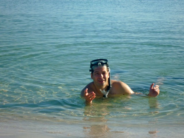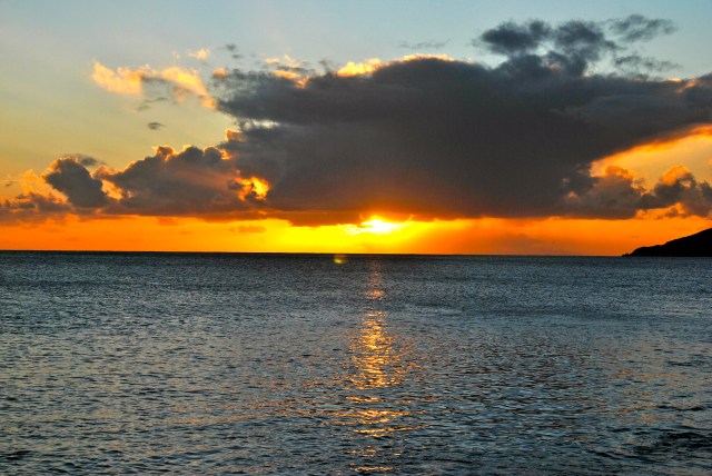 We went snorkeling this day at Blue Beach. The highlight of that trip was seeing a group (family?) of squid gliding merrily along, until they were interrupted by my curiosity. When squid are “alarmed” they don’t scamper away like most fish. They stop and hover. Hover! Like a UFO. I saw that as a challenge, naturally. Their beady eyes never left mine, as I slowly inched closer and closer. If I could just touch one….