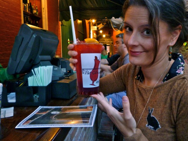 We still have a bit of time before our ghost tour, so we head to Pat O’Brien’s to get her a hurricane and some [fried] alligator.
